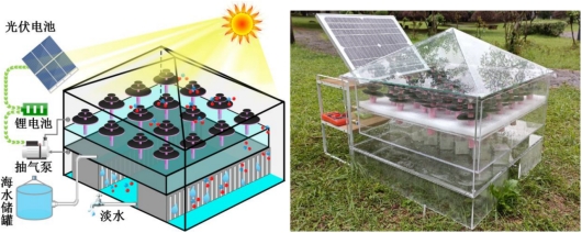 2 仿松树型太阳能界面蒸发海水淡化装置结构示意图()和实物图()