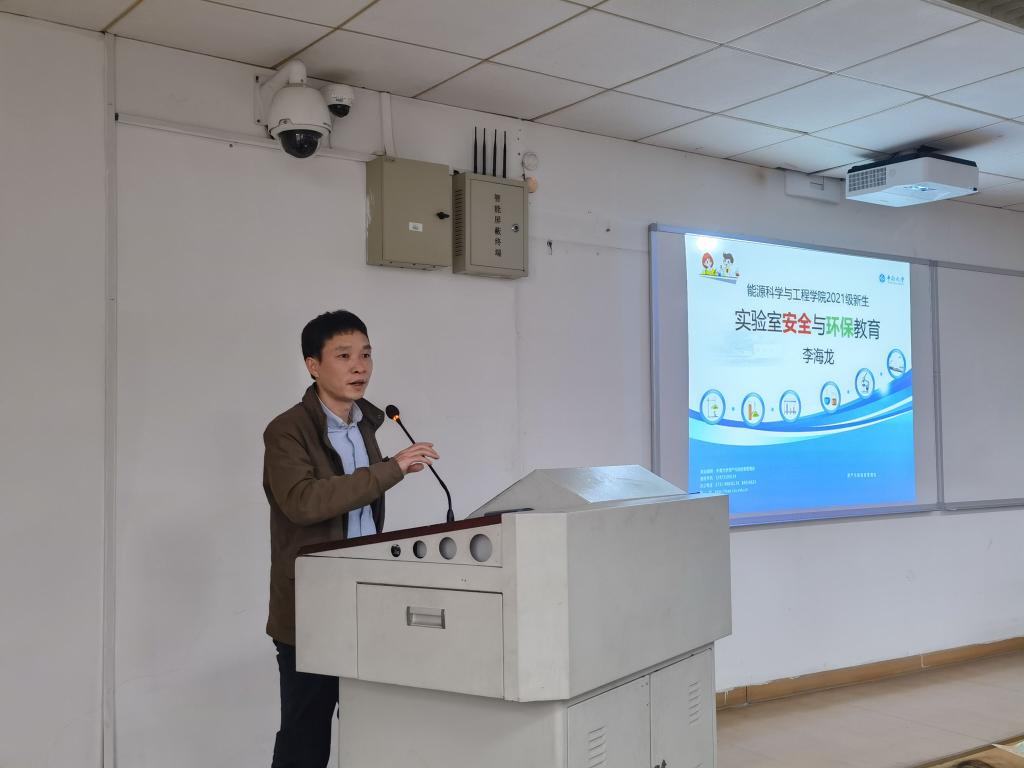 于校本部科教南楼602开展实验室安全与环保教育线下讲座。此次讲座旨在让同学们学习安全环保知识,树立安全环保意识,增强应急处理能力。本次讲座由分管实验室工作的李海龙副院长主讲,能源院21级全体新生参加。