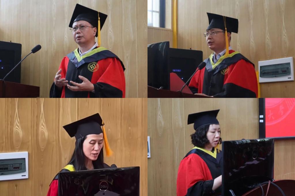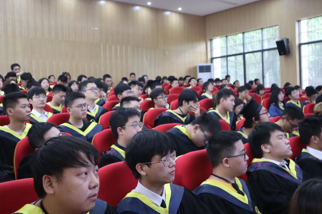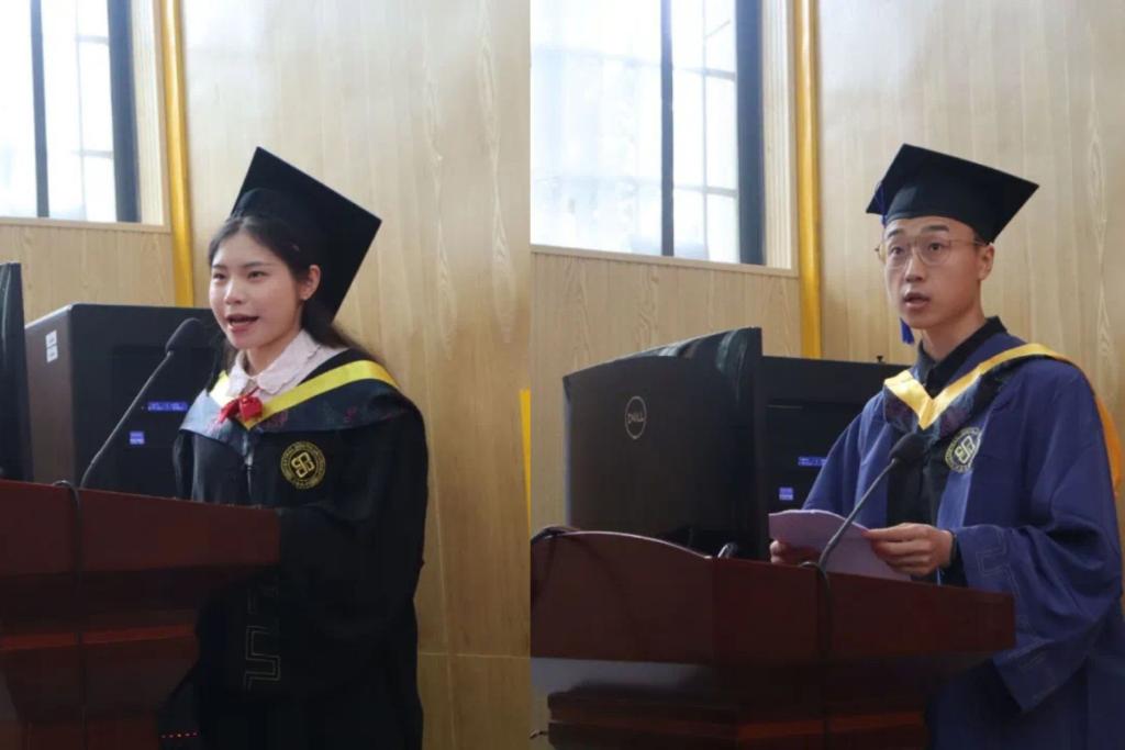 优秀毕业生表彰决定,并由廖胜明书记、孙志强院长为获奖代表颁奖;党委书记廖胜明发表了慷慨激昂的讲话,本科毕业生代表左露洁,硕士生代表姚尧也在此表达出了心底的感激与不舍。在学位授予环节,各位教授先后为毕业生拨穗正冠,颁发学位证书,进行合影留念。