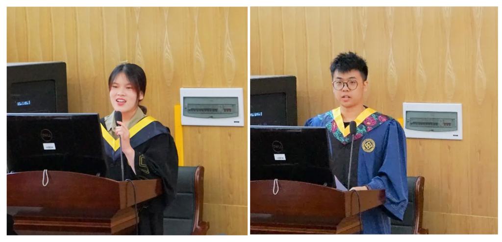 随后,本科毕业生代表伍旺,硕士生代表吴燕杰分别发言。伍旺同学回首本科四年生活,表达了对同学的不舍、对老师的感谢与对未来的展望,能源学子在“知行合一”精神的指引下,要以饱满的战斗激情,躬身实践,服务社会;在“经世致用”精神的鼓舞下,要以中南人特有的姿态,奉献青春,实现自我。吴燕杰同学说道,现在的离别意味着一段新征程的开始。无论去向何方,有何际遇,都要时刻谨记母校“知行合一、经世致用”的校训,铭记“向善、求真、唯美、有容”的中南精神,不忘初心,砥砺前行。