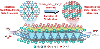乙醇水蒸气重整制氢催化剂失活一直是阻碍其推广应用的主要瓶颈。该研究采用氢氟酸刻蚀和等体积浸渍方法,以Mo2TiC2Tx(Mxene)材料作为载体,构筑了一系列yNi/Mo2TiC2Tx(Ni/MTC)衍生的Ni-Mo合金催化剂,有效促进了乙醇低温活化和高选择性制氢。在550℃下,氢原子利用率可达95.6%,且在反应100小时后无明显失活。其优异的性能源于Ni-Mom-Mo2-mTiC2Tx结构的形成,加强了金属-载体之间的相互作用。通过密度泛函理论计算,比较了乙醇在Ni(-1.07 eV)和Ni/MTC(-1.46 eV)表面的吸附能,证明了Ni/MTC催化剂在乙醇水蒸气重整制氢过程中活化乙醇的优越性。该研究为设计和开发高稳定性的Mxene基催化材料提供了新思路,有望促进乙醇低温重整技术的实际应用。