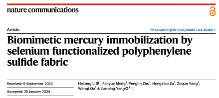 近日,W88优德李海龙教授、杨建平副教授等再次在国际顶尖自然指数期刊《Nature Communications》上发表研究论文,论文题名为“Biomimetic Mercury Immobilization by Selenium Functionalized Polyphenylene Sulfide Fabric”。