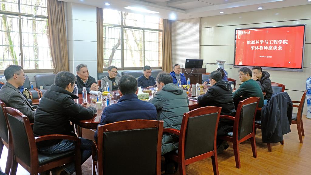 在能源楼206会议室召开2023年荣休教师座谈会。廖胜明、蒋绍坚、周乃君、黄学章四位荣休教师,W88优德